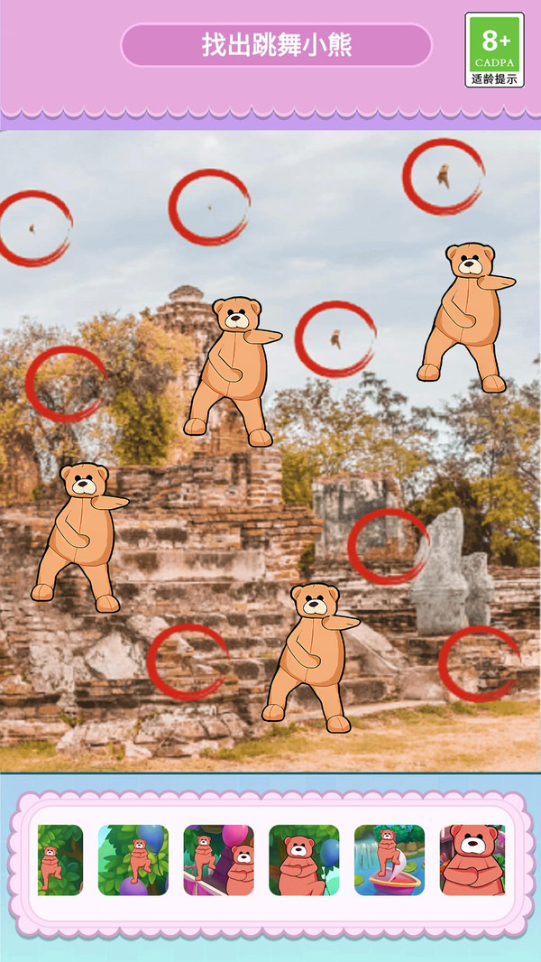 1.点击目标完成挑战:在动图场景中寻找跳舞的小熊,精准识别后点击完成挑战,考验玩家的集中力与眼部追踪反应能力。