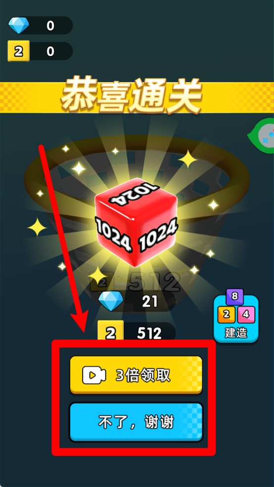 2.通关奖励翻倍:顺利过关后可点击“3倍领取”,看广告即可获得更多奖励资源,快速升级方块实力。