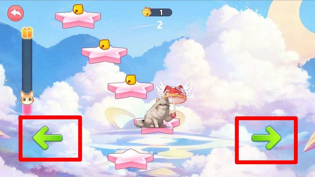 1.跳跃闯关玩法:点击左右箭头控制猫咪跳跃前进,收集铃铛同时避开掉落,考验你的节奏与反应力。