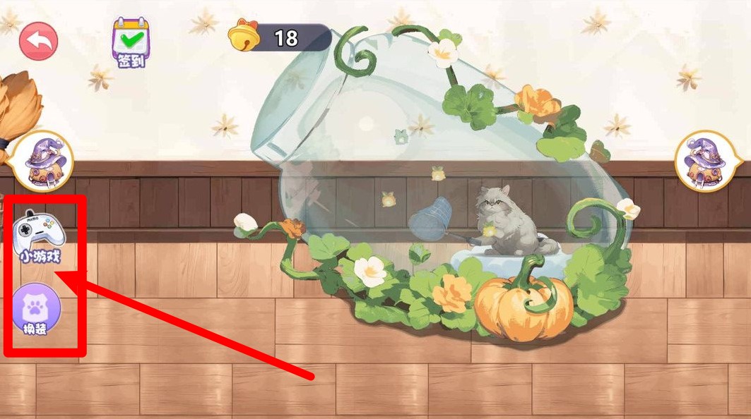 3.辅助功能按钮:画面左侧设有“小游戏”与“换装”图标,点击即可快速进入轻松玩法或更换猫咪造型,操作流畅便捷。