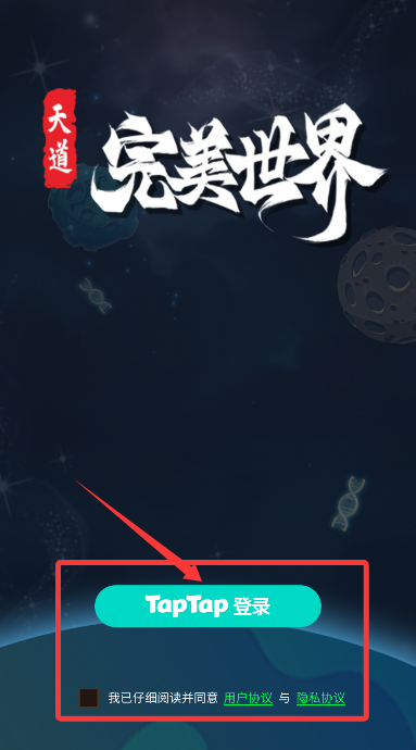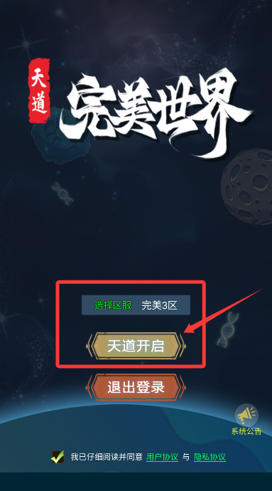 1、游戏启动后,在登录界面阅读并同意用户协议,开启你的天道世界之旅。