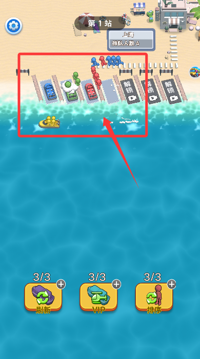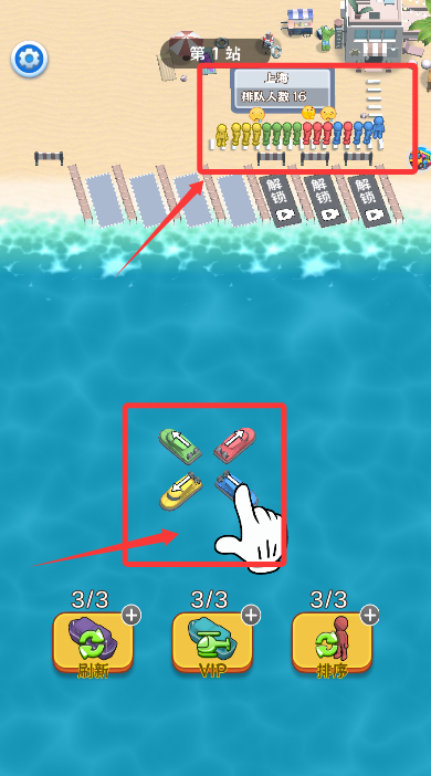 2、观察候船乘客服饰颜色,将同色系小船拖至对应人群接载。