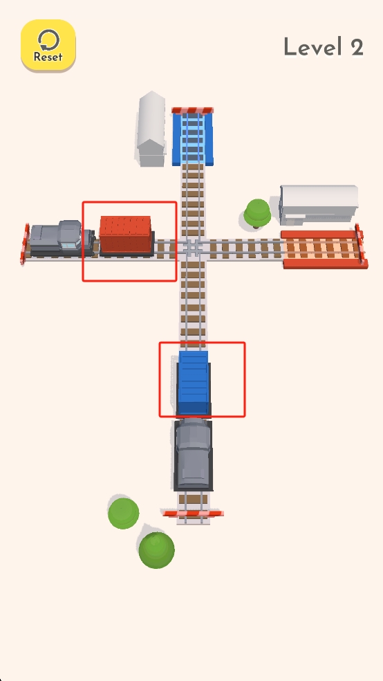 2、关卡面对交叉轨道布局,拖动蓝色车厢避开横向的红色车厢,调整其位置让火车头能够与车厢沿主轨道自然衔接。