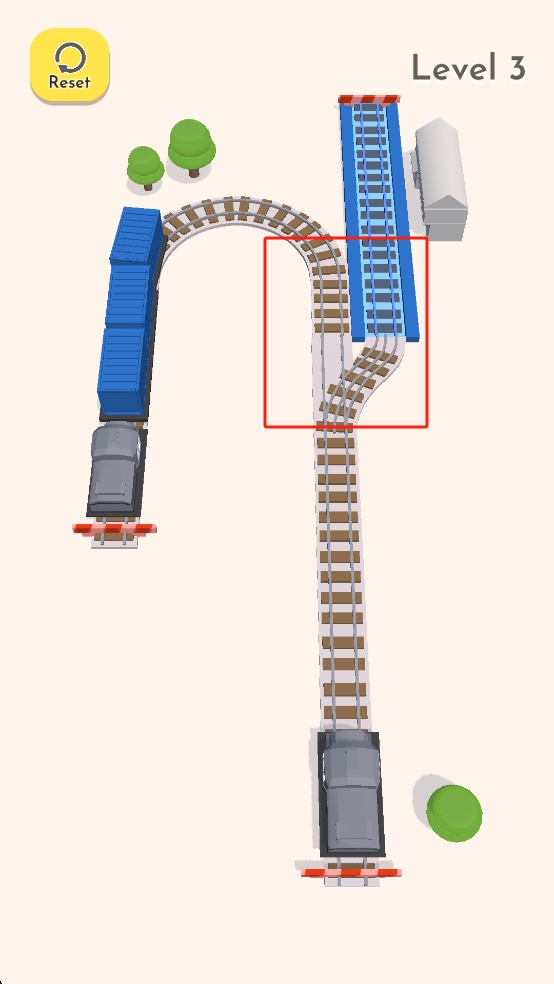 3、这关出现了弯道与分轨设计,规划火车头的行驶路线,借助弯曲轨道连接蓝色车厢,灵活调整轨道走向,让火车可以顺利接驳目标车厢。