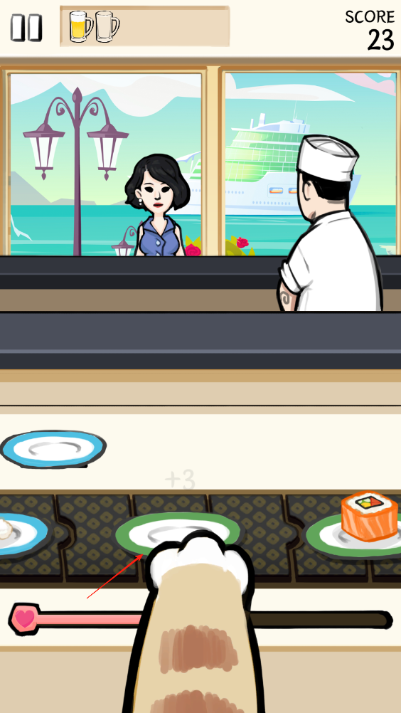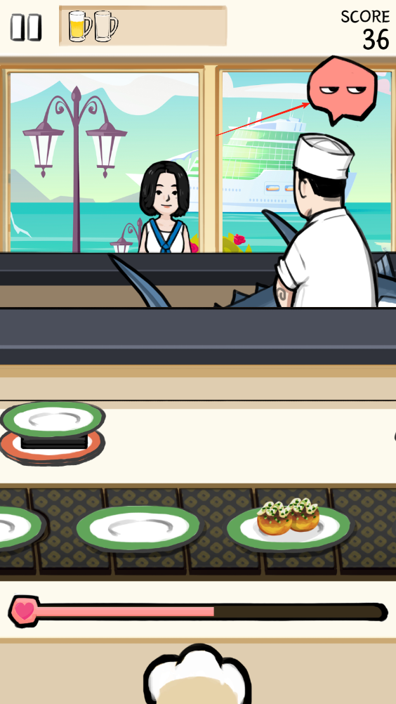 2、紧盯厨师的动作,在其转身的瞬间停止偷吃,避免被发现,也要时刻注意底下的饥饿条,清空时也会结束游戏。