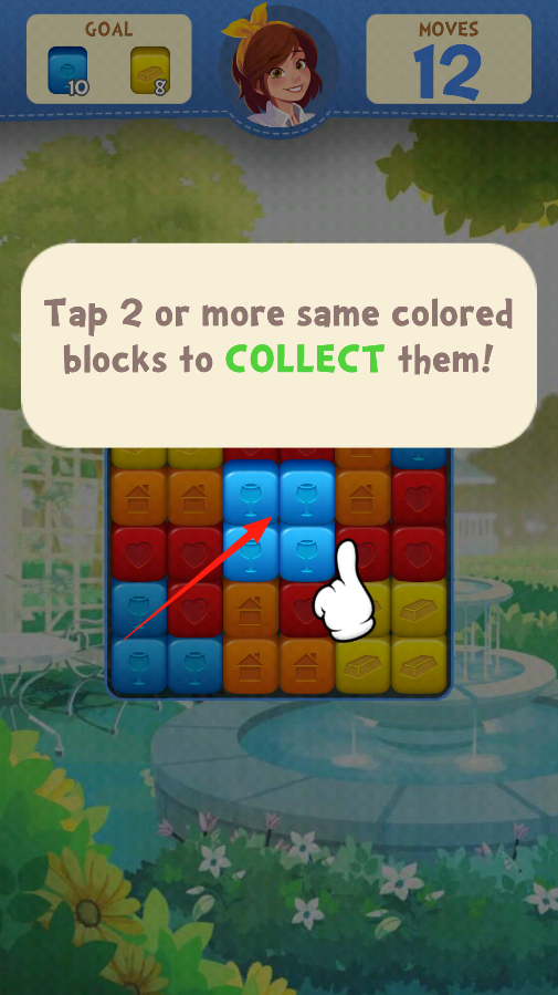 1、进入消除关卡,界面提示Tap2or more same colored blocks to COLLECT them,点一下,就能把连一起的蓝色方块收掉,凑目标数量。