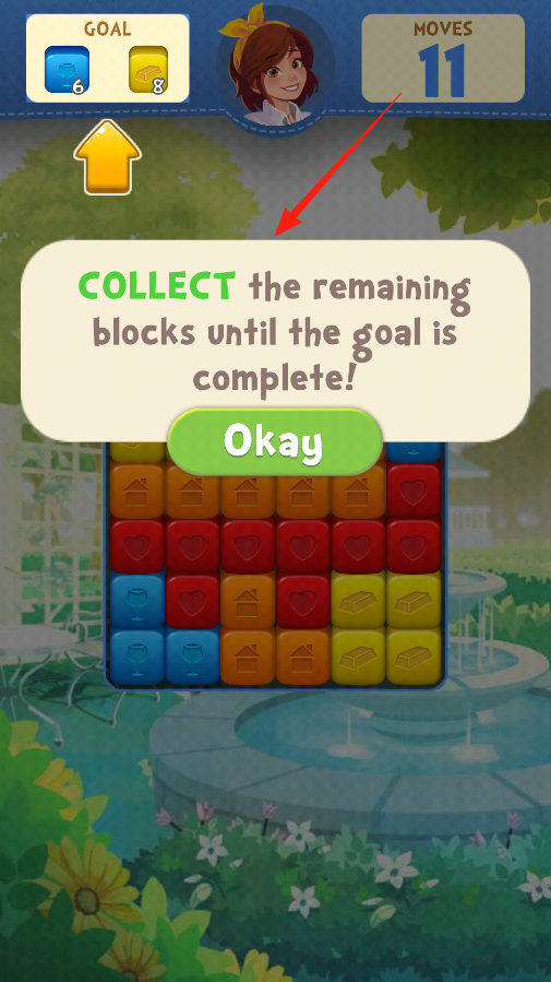 2、消除一波后,弹出COLLECT the remaining blocks until the goal is complete提示,点Okay继续,接着找同色方块消除,把目标数量凑够。