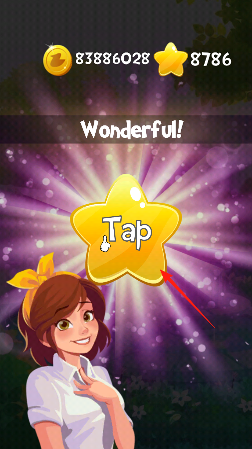 3、成功通关,出现Wonderful奖励界面,有金币星星,还有大星星Tap按钮,点这星星领奖励,然后能接着玩下一关攒更多金币星星,解锁新内容。