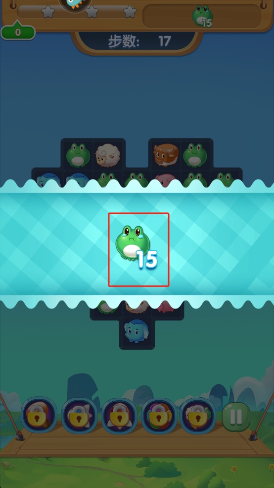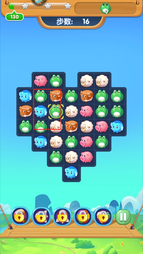 2、观察棋盘内青蛙、绵羊等动物布局,连接三个及以上同色动物构建消除链,借连消触发特效,快速清空区域。