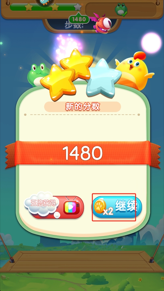 3、关卡结束后,界面呈现新分数1480,点击右侧的继续按钮,领取2倍金币奖励,进入下一关或主界面。