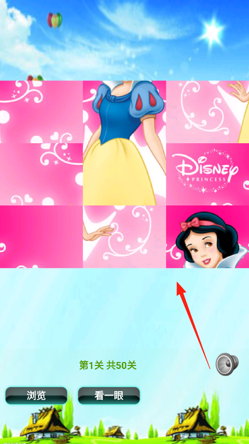 2、进入第一关拼图,界面是打乱的白雪公主图块,滑动屏幕,把这些图块拖来拖去,找对应的位置拼接,慢慢把完整的公主画像拼出来,看看能不能顺利通关。