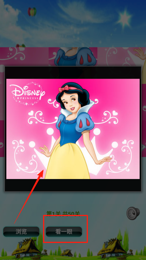 3、拼完图后,点看一眼按钮,会弹出完整的白雪公主画像,欣赏一下成果,要是觉得没拼够,还能重玩这关,或者继续挑战下一关,接着拼更多公主图。