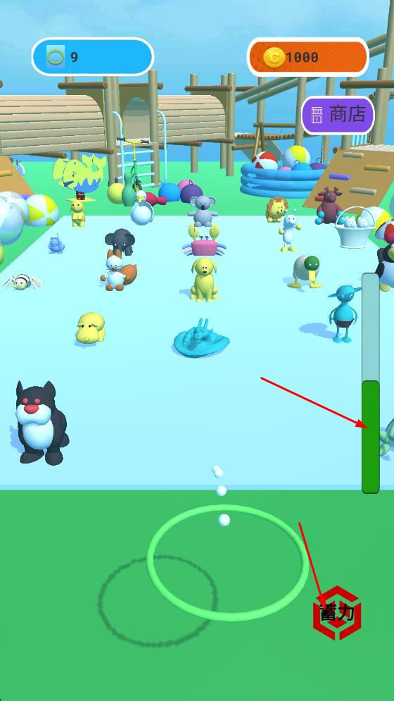 2、释放蓄力后,圆环将飞向玩偶,成功套中可获取分数,同时留意右侧力度条,合理控制投掷力度。