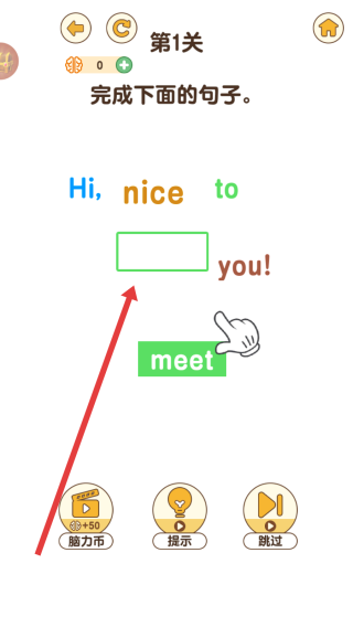 2、在第1关,将下方绿色meet单词拖入空白方框,补全Hi,nice-to-meet-you!的句子,完成关卡内容。