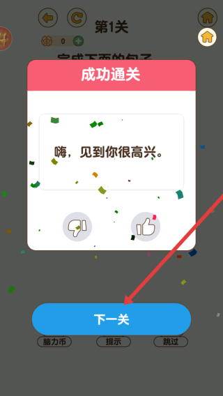 1、点击最强大脑3主界面橙色点击开始游戏按钮,进入第1关,开启文字拼接的益智挑战,准备完成句子填空任务。