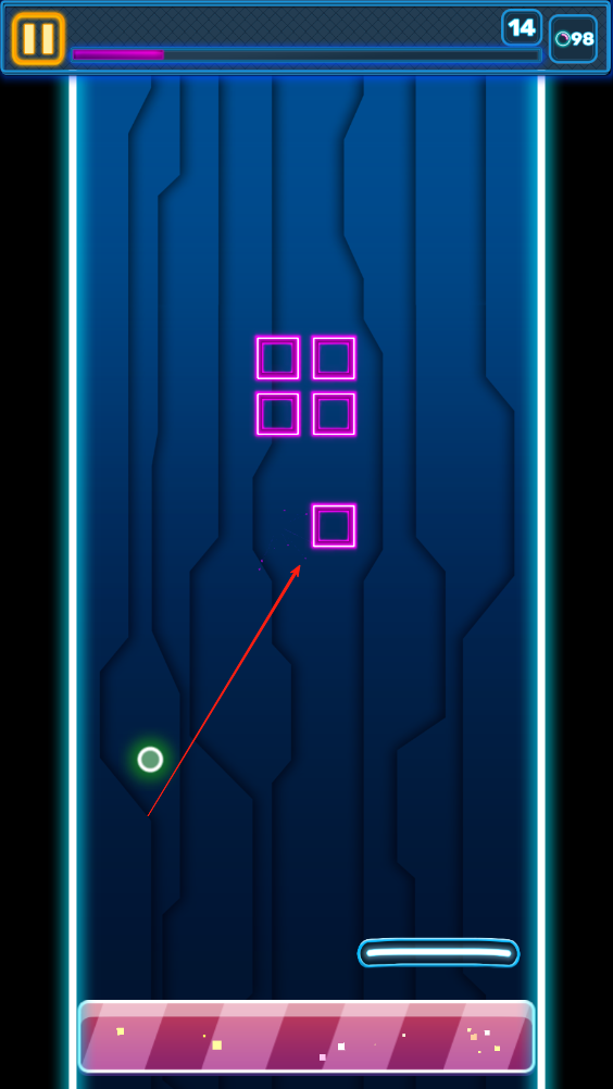 1、通过左右滑动屏幕控制下方台子移动,接住小球并弹飞,使其弹向最近的方块,消除屏幕上出现的所有方块。