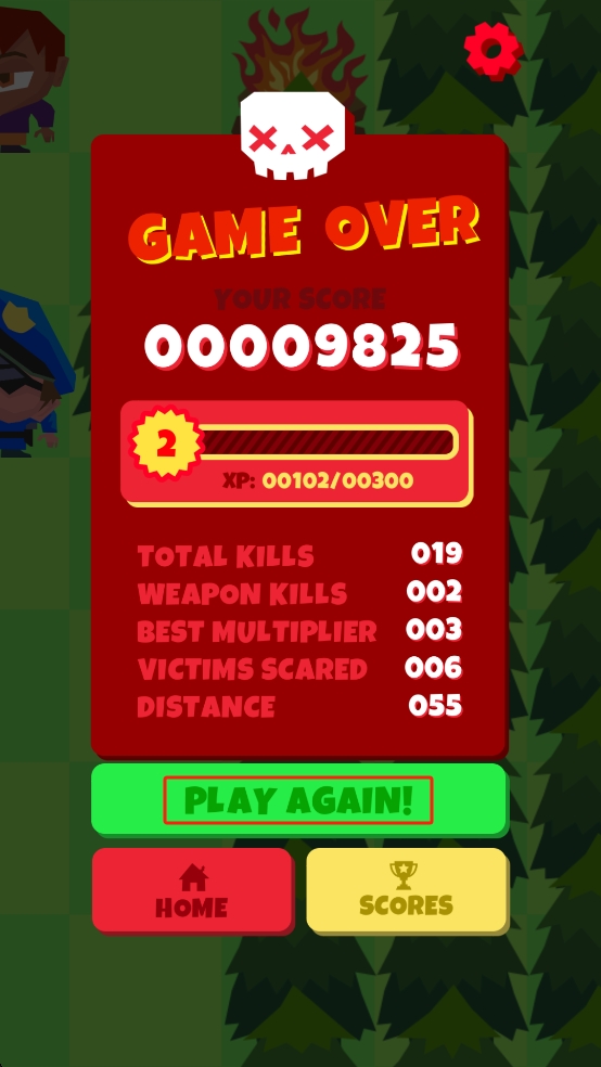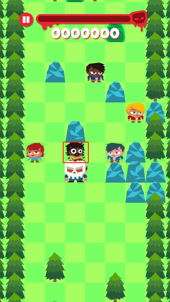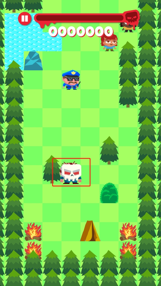 1、操控骷髅头角色在营地场景移动,靠近人类角色,触发攻击或惊吓效果,消灭目标以积累游戏分数。