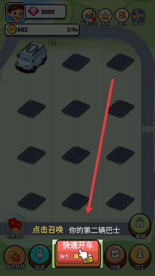 2、在停车场界面,可点击底部快速开车Lv1消耗10金币赚取收益,也可等召唤CD29:55结束,点击召唤获取第二辆巴士,壮大车队阵容。