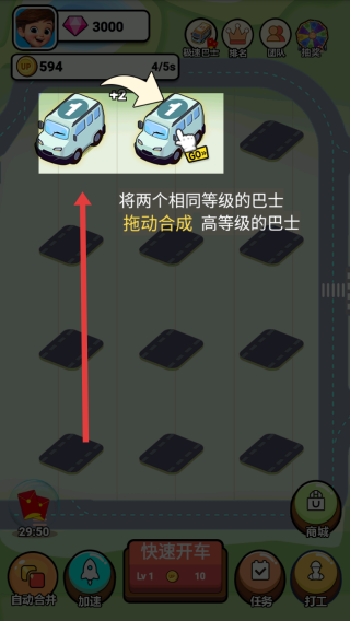 3、当出现两辆同等级巴士时,拖动它们至同一位置合成高等级巴士,提升车队实力,同时留意金币与钻石积累,为巴士升级和扩张储备资源。