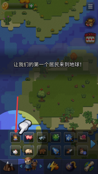 1、在游戏中,选择第一个居民,让他来到你的地球世界,准备后续发展。