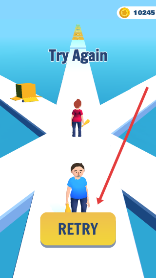 3、闯关失败后,点击下方黄色RETRY按钮,可重置进程,再次挑战LEVEL-1,争取顺利通过旋转障碍,继续游戏征程。