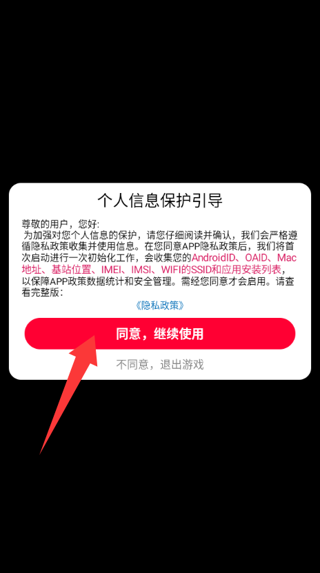 1、点击个人信息保护引导里的同意继续使用。