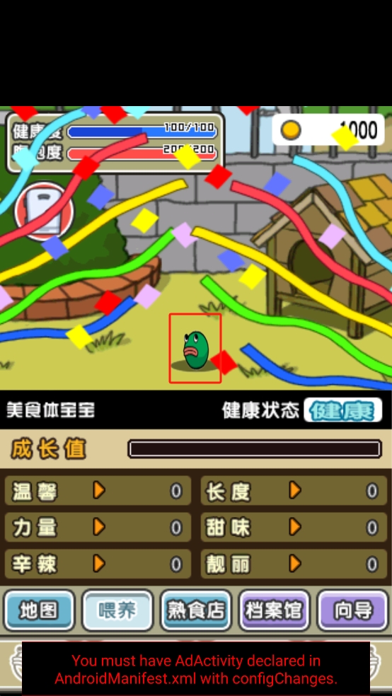 1、主界面中聚焦绿色美食生命体,查看其健康度、成长值条,以及温馨、力量等六项初始属性均为0的状态。