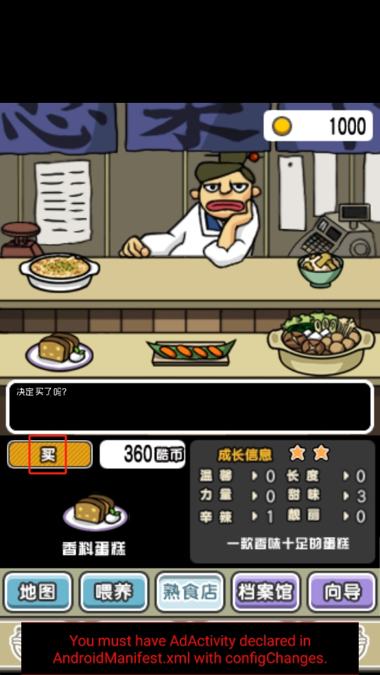 3、切换到熟食店界面,选中香料蛋糕,点击左侧的买按钮,消耗360酷币购入,用于喂养美食体,助力其属性提升。