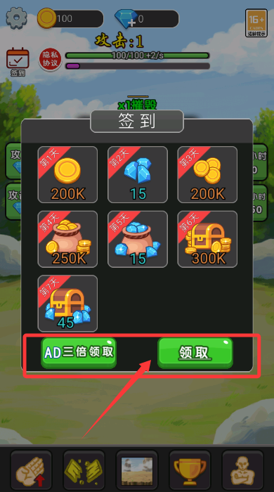 1、登录游戏后前往签到页面,选择普通领取或观看广告获取三倍资源奖励。