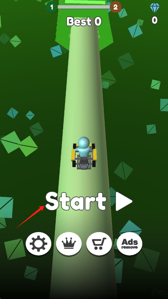 1、点击Start,开启绿色赛道的竞速挑战,操控角色驾驶车辆,在赛道上全力冲刺,点击开始游戏。