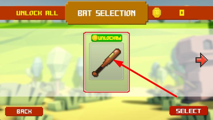2、进入“BAT SELECTION”界面,选择已解锁的棒球棍,点击SELECT,装备该武器,准备战斗。