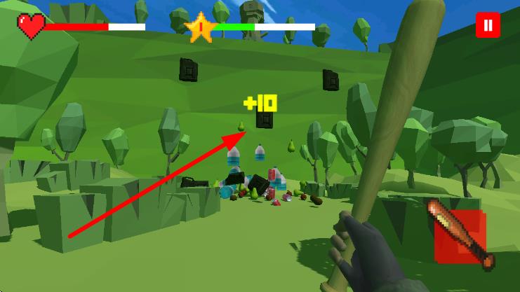 3、进入游戏场景,操控角色用棒球棍击打箭头指向的物品,获取+10奖励,收集垃圾、提升等级,推进冒险。