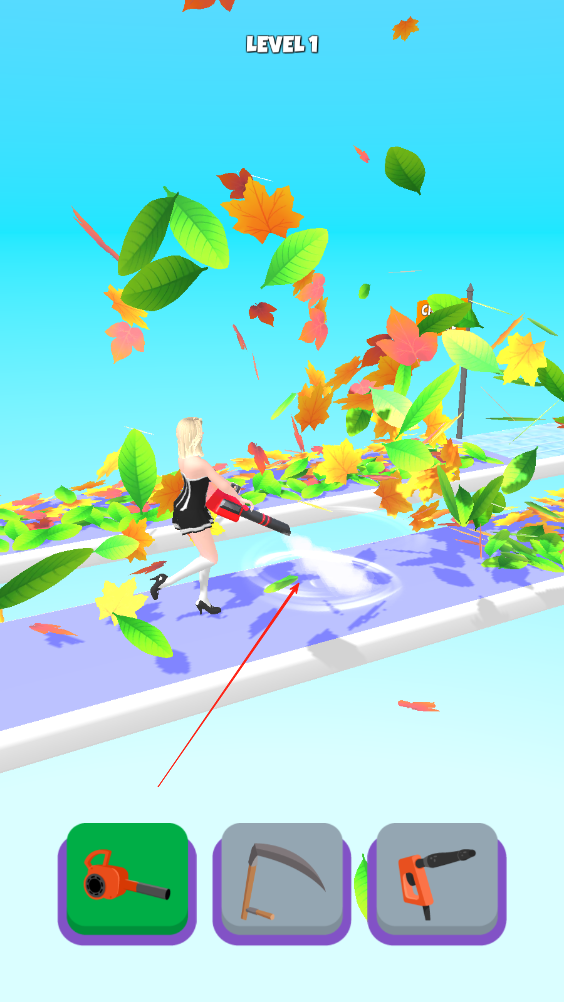 1、根据前方场景选择合适的清洁工具吗,前方一地落叶,我们需要拿吹风机将一地的落叶吹开,女孩才能继续向前走。