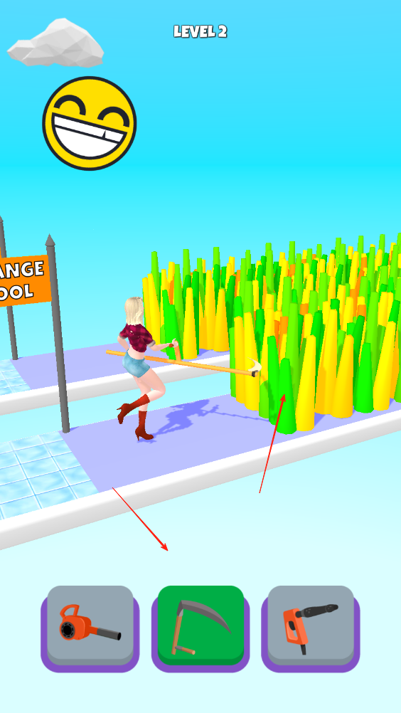 2、切换工具一定要及时,不然会被绊脚,选择镰刀,将前方农作物都切割掉即可继续前进。