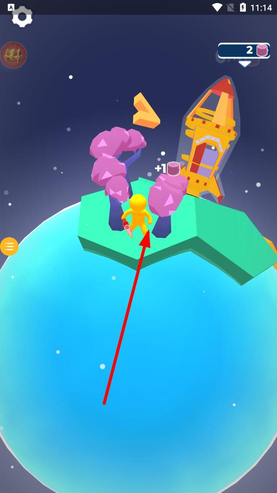 1、进入星球,操控角色靠近粉色树木等资源,靠近后,自动砍伐点击触发采集,收集能量桶储备火箭材料,奠定发展基础。