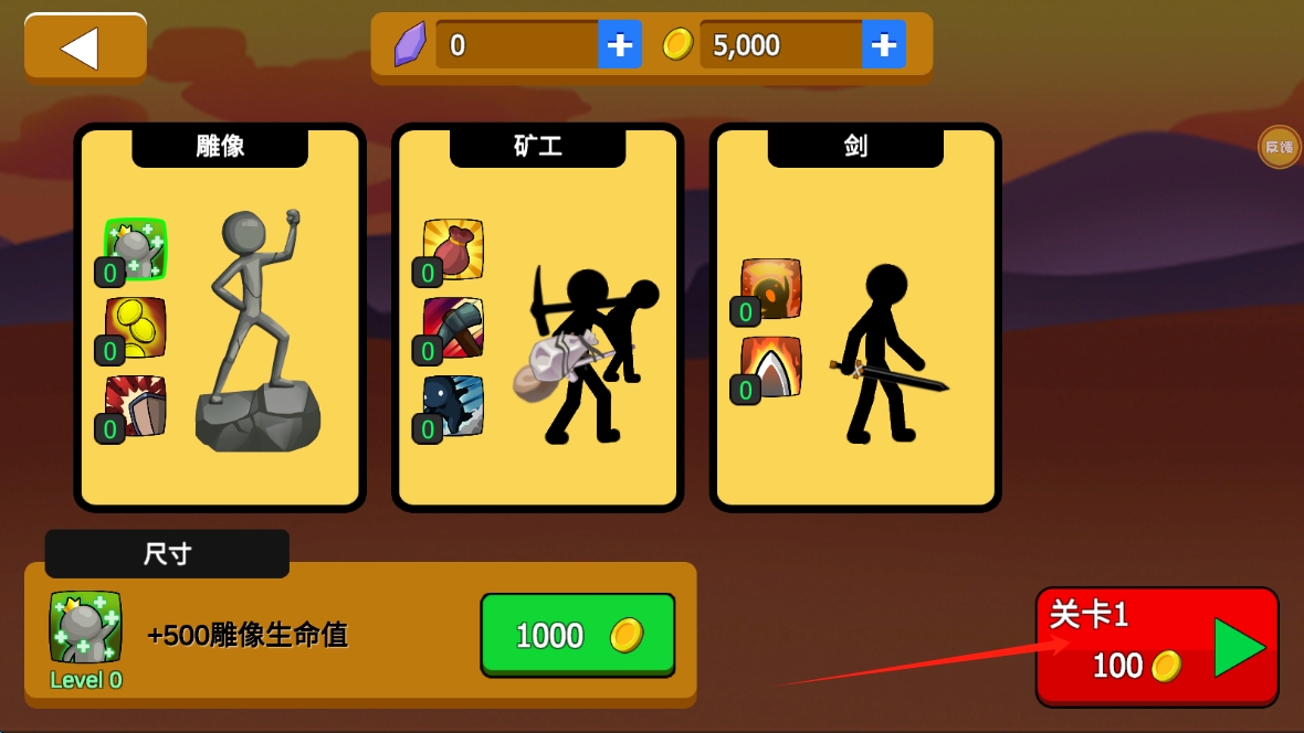 2、在资源和升级界面,优先评估雕像的生命值情况 ,若金币足够,点击选择关卡。