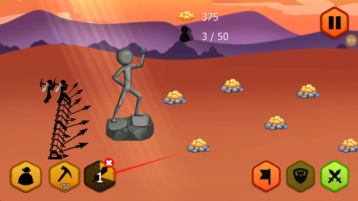 3、在战斗界面,密切关注上方显示的金币数量和敌人数量,先点击左侧矿工按钮。