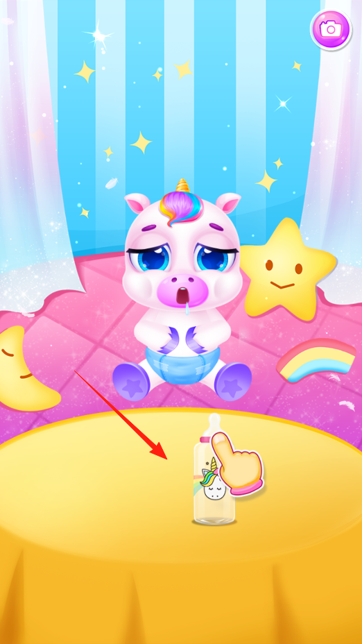 1、看到可爱独角兽宝宝流口水,桌上有带独角兽图案的奶瓶,点奶瓶,给宝宝喂奶,满足它的需求,让它开心起来,这是照顾小独角兽的第一步,看看喂完会有啥变化。