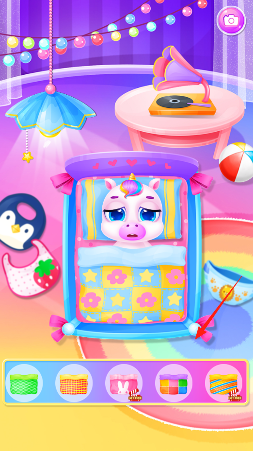 2、小独角兽要睡觉啦,界面下方有不同样式的被子,选喜欢的被子,拖到小独角兽身上,给它盖好,让它舒舒服服睡大觉,每种被子盖上去,说不定场景氛围还会变,试试换被子。