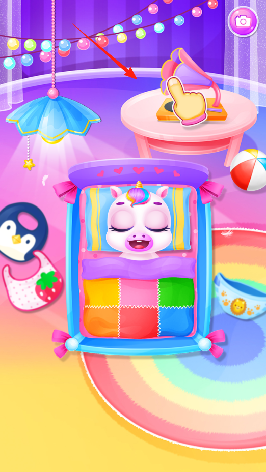 3、小独角兽盖好被子,旁边有唱片机,点唱片机,播放音乐,给小独角兽营造温馨睡眠氛围,听着音乐,小独角兽能更好入睡,看看播放音乐后,它会不会睡得更香甜。