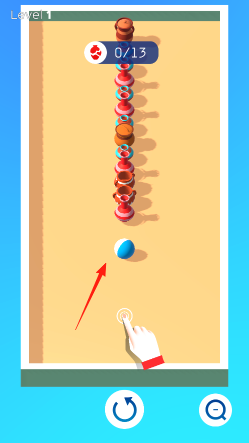 2、第一关开始,屏幕有一排陶罐,下方是小球,长按屏幕控制小球发射方向,松手让小球弹出去,撞碎陶罐,按提示操作,打碎13个陶罐完成这关。