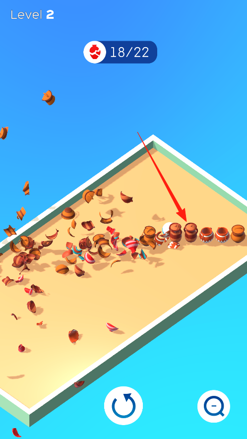 3、到第二关,陶罐零散分布,滑动屏幕调整小球路线,让小球滚动起来,碰到陶罐就打碎,盯着顶部18/22进度,打碎22个陶罐,注意躲避碎罐,继续推进。