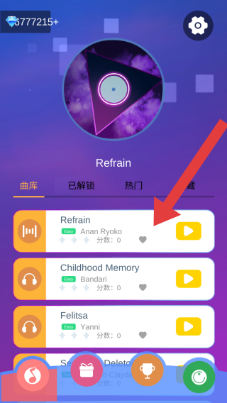 1、画面呈现曲库的页面,可以根据玩家自身喜好随机点击一首歌曲进行游玩,还有已解锁、热门的曲库。