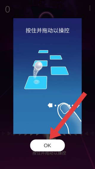 2、画面呈现了新手教程的提示:按住并拖动以操控,玩家了解玩法规则后,可点击OK继续进行游玩。