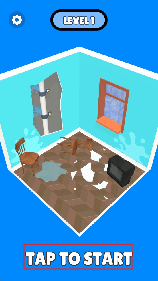 1、点击屏幕下方的按钮,进入呈现破损窗户、漏水管道及杂乱家具的房间场景,优先聚焦漏水管道的修复任务。