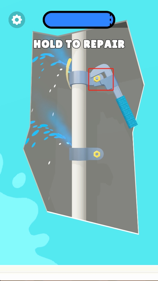 2、切换到漏水管道修复环节,长按画面中红框标注的扳手工具,保持按压状态,借助扳手对管道漏水处进行持续操作。