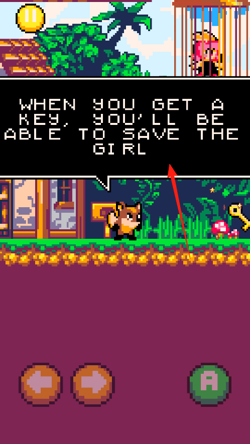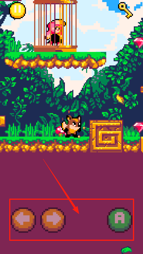 3、游戏中,用左右箭头按钮控制狐狸移动方向,点A按钮让狐狸跳跃互动,操控狐狸避开障碍,收集宝石,往笼子方向前进,用这些按钮配合,帮狐狸救女孩完成冒险 。