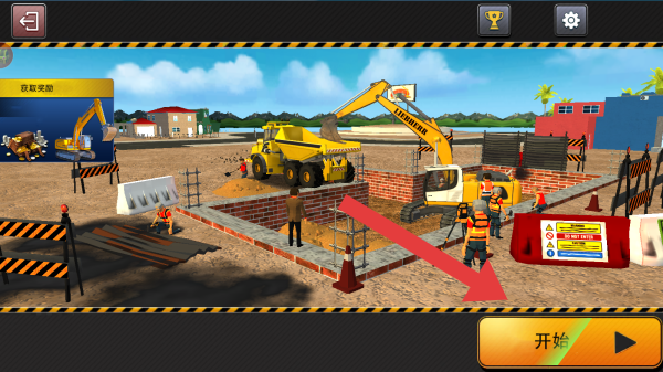 1、画面呈现了施工的现场,有众多工人围绕着场地进行勘察,点击开始方可进入场景进行游玩。