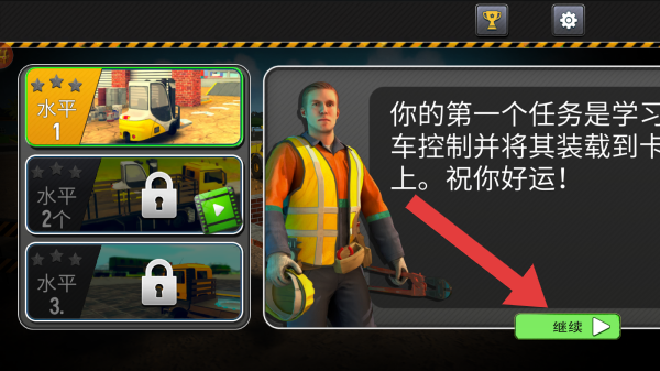 2、呈现了水平1-水平3的关卡模式,其中只有1是处于解锁状态,其余暂未解锁,第一个任务是学习怎么控制车。