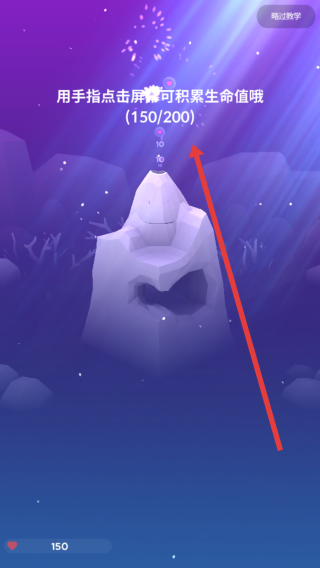 1、游戏初始,按提示用手指点击屏幕,为石头积累生命值,助力其从150向200成长,推进养成进程。